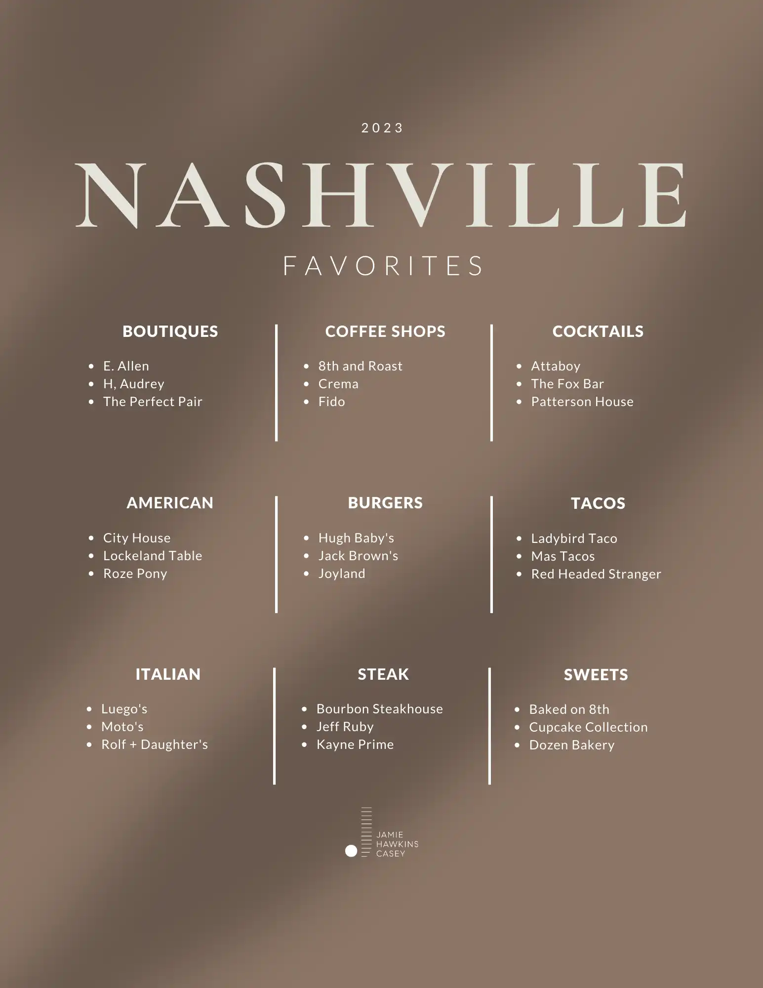 If you know me, you know eating and drinking my way through Nashville is a favorite past time. I’ve collected a few current favorites for you to explore – whether you’ve lived in Nashville for year or are exploring it for the first time. Enjoy!
